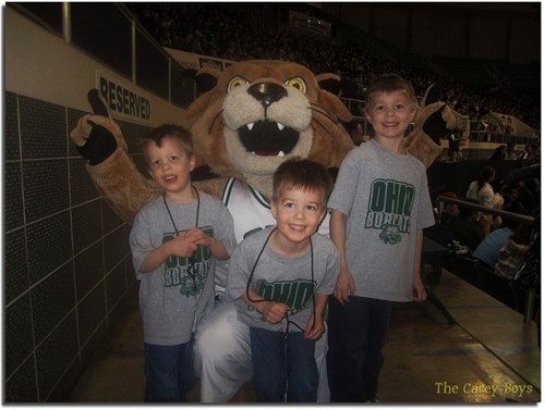With some time to kill we hit the bookstores and had lunch before the actual game. I was selected as the Ohio Bobcat Club fan of the game so we spent some time pre-game in the Rohr Room eating their popcorn. The boys enjoyed seeing their picture in the program and on the video screens during the first media timeout.